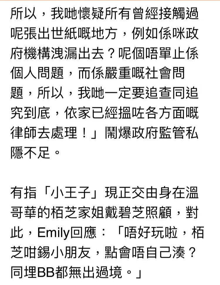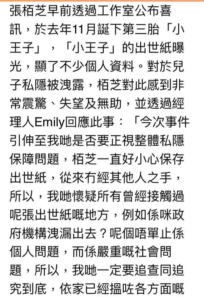 腾讯娱乐讯 据港媒报道,张柏芝早前通过工作室公布喜讯,于去年11月诞下第三胎“小王子”,本来是一件开心的事,可惜,有传媒今天刊登了“小王子”的出生证,使第三子的隐私资料全面曝光,柏芝对此感到非常震惊、失望及无助,并通过经理人Emily回应此事:“这次媒体严重侵犯艺人及其家人隐私,出生证柏芝一直很小心保存,从来没有经过别人手。所以,我们现在怀疑所有曾经接触过这张出生证的地方,例如政府机构,当中是否有人收受利益而故意泄露他人私隐?这个不单是个人问题,而是严重的社会问题,也是大众隐私保障问题。我们一定会追查和追究到底,现在已经找了各方面的律师去处理!”