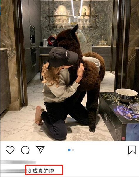 随后,赵子易在社交账号中晒出了一只棕色羊驼的照片,赵子易半跪在地板上,非常亲昵的搂着羊驼,似乎对这只新宠非常喜爱,还欣喜的配文称:变成真的啦。