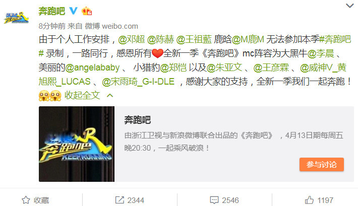 由于个人工作安排,邓超、陈赫、王祖蓝、鹿晗无法参加本季#奔跑吧# 录制,一路同行,感恩所有。全新一季《奔跑吧》mc阵容为大黑牛李晨 、美丽的Angelababy 、小猎豹郑恺 以及朱亚文 、王彦霖 、黄旭熙、宋雨琦,感谢大家的支持,全新一季我们一起奔跑!