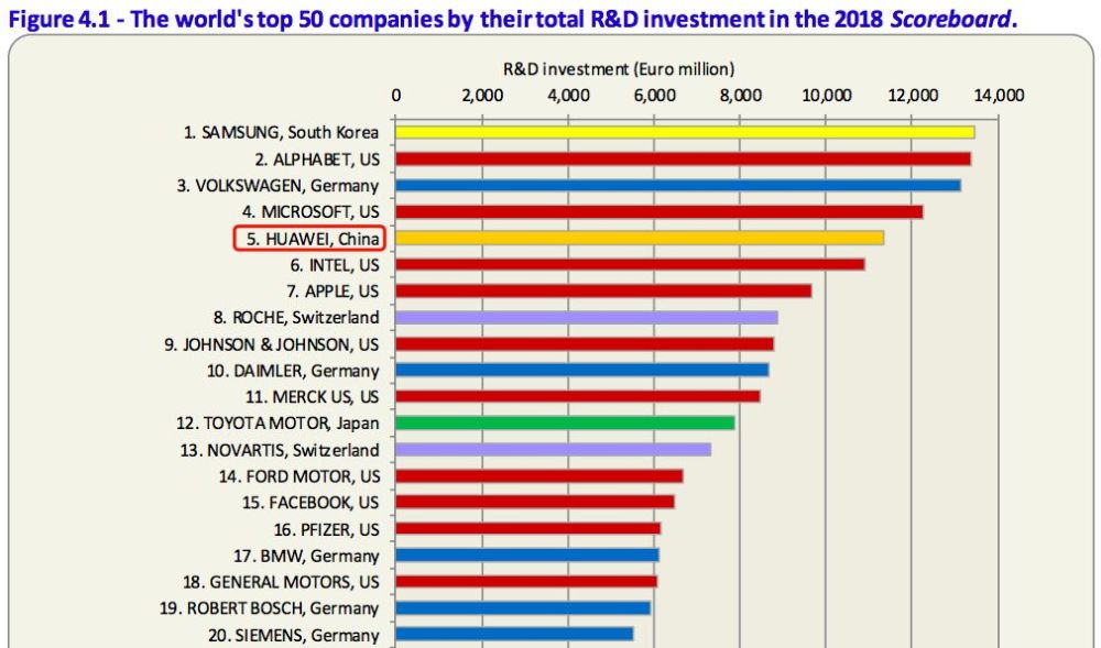 欧盟委员会公布的《2018年欧盟工业研发投资排名》,华为以113.34亿欧元位列世界第五,也是唯一一家上榜前五十的中国公司。