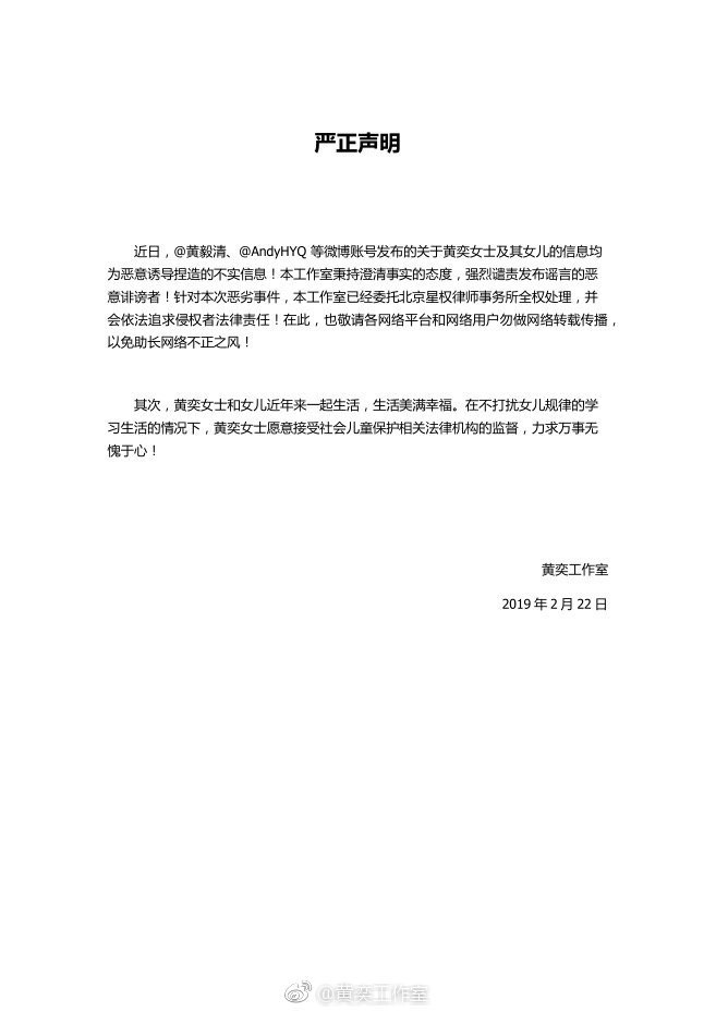 腾讯娱乐讯 近日,黄奕前夫黄毅清突然又开始在微博上“揭发”黄奕的“黑料”。这次他不再空口说白话,而是让女儿铛铛出镜,自述自己被“欺负”的经过。黄毅清发女儿视频,视频中黄奕女儿自述被妈妈男友动手动脚等。针对黄毅清2月21日的爆料,黄奕工作室2月22日发布声明,称已交由律师处理,对恶意诽谤的违法侵权行为绝不姑息。