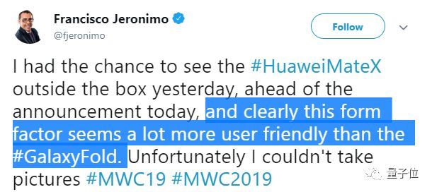 Mate X的设计,也得到了分析师的认可,数据分析机构IDC副总裁Francisco Jeronimo表示,对用户来说,Mate X的外形似乎比三星Galaxy Fold更加友好 。