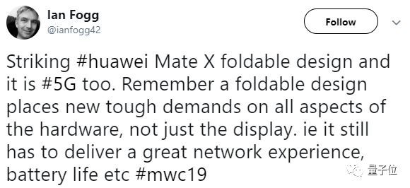 运营商数据分析公司OpenSignal的副总裁Ian Fogg发表Twitter称,Mate X的可折叠设计引人注目。