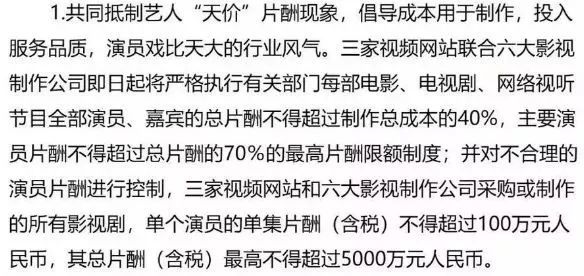 几大视频播出平台和影视制作公司也发了联合抵制不合理片酬的声明,要求单个演员的单集片酬(含税)不得超过100万人民币,其总片酬(含税)最高不得超过5000万元。