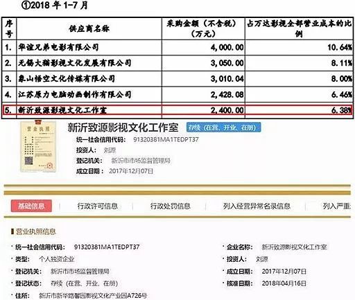 2018年向新沂致源影视文化工作室支付艺人经纪费用2400万。新沂致源成立于2017年底,投资人是刘源,演员刘昊然本名叫刘源,猜测这是刘昊然的公司。万达2018年投资的刘昊然参与的作品有《唐人街探案2》和《远大前程》,其中《唐探2》刘昊然是主演,这2400万猜测是其片酬。