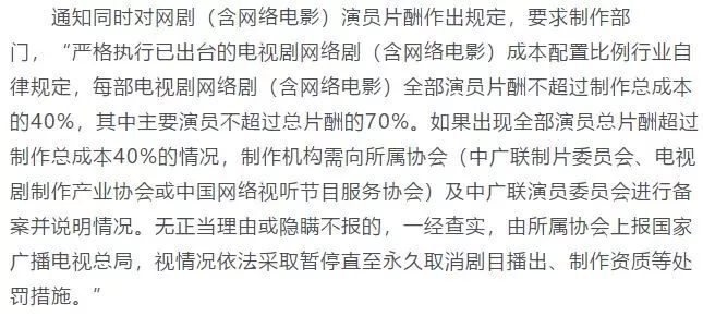 去年,国家广播电视总局下发通知,要求每部电视剧网络剧(含网络电影)全部演员片酬不超过制作总成本的40%,其中主要演员不超过总片酬的70%。无正当理由或隐瞒不报的,一经查实,视情况依法采取暂停直至永久取消剧目播出、制作资质等处罚措施。