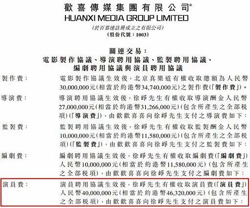 2月26日,港股上市公司欢喜传媒发了一则关于徐峥新片《囧妈》的公告,欢喜传媒旗下两家间接全资附属公司欢喜首映和欢欢喜喜分别和徐峥的真乐道文化及徐峥本人签订协议,真乐道文化收取该片制作费3000万,徐峥收取导演费2700万、监制费1000万、编剧费1000万、演员费4000万。