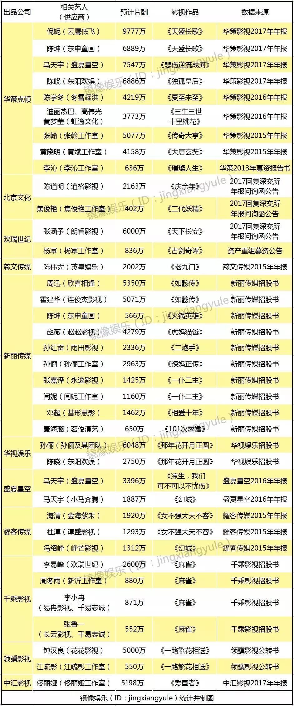 另据自媒体镜像娱乐此前统计华策影视、北京文化、欢瑞世纪、慈文传媒、新丽传媒等公司的年报及招股书,曝光了近40个明星的片酬。