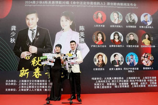 共工日报社娱乐电(龚国林)2024年2月25日,由上海臻济文化传播有限公司主办,上海滨之声文化传媒有限公司及上海古尘影视文化传媒有限公司协办,上海追梦人人才服务(集团)有限公司大力支持下,龚少秋&陈美惠情歌对唱《命中注定你是我的人》新闻发布会在上海百年演绎隆重举办,并取得圆满成功。