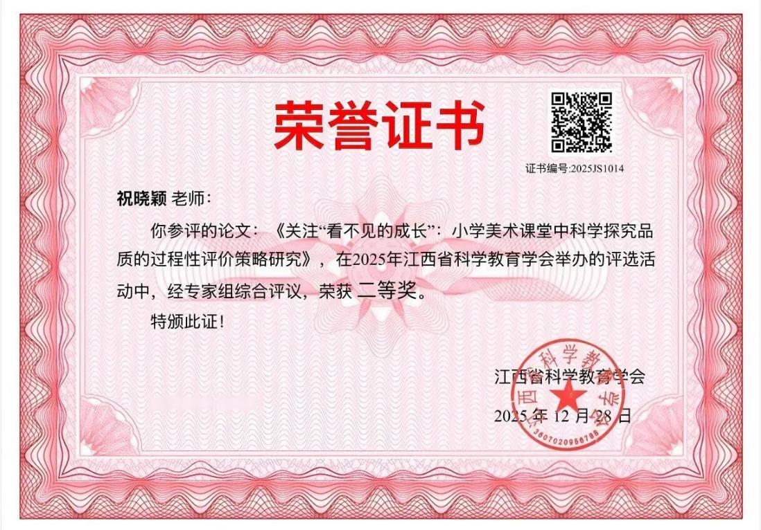 该校祝晓颖老师撰写的论文《关注“看不见的成长”:小学美术课堂中科学探究品质的过程性评价策略研究》凭借新颖的研究视角、扎实的论证过程与实用的实践价值,荣获江西省二等奖,充分彰显了学校教师在教育教学研究领域的深厚积淀与创新探索精神。